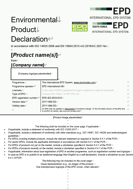 EPD 템플릿 - 기타 모든 제품 카테고리: 한국 전용 템플릿 ·EPD template - All other product categories (Version 2.0 of the default indicator list based on GPI 5) 다운로드